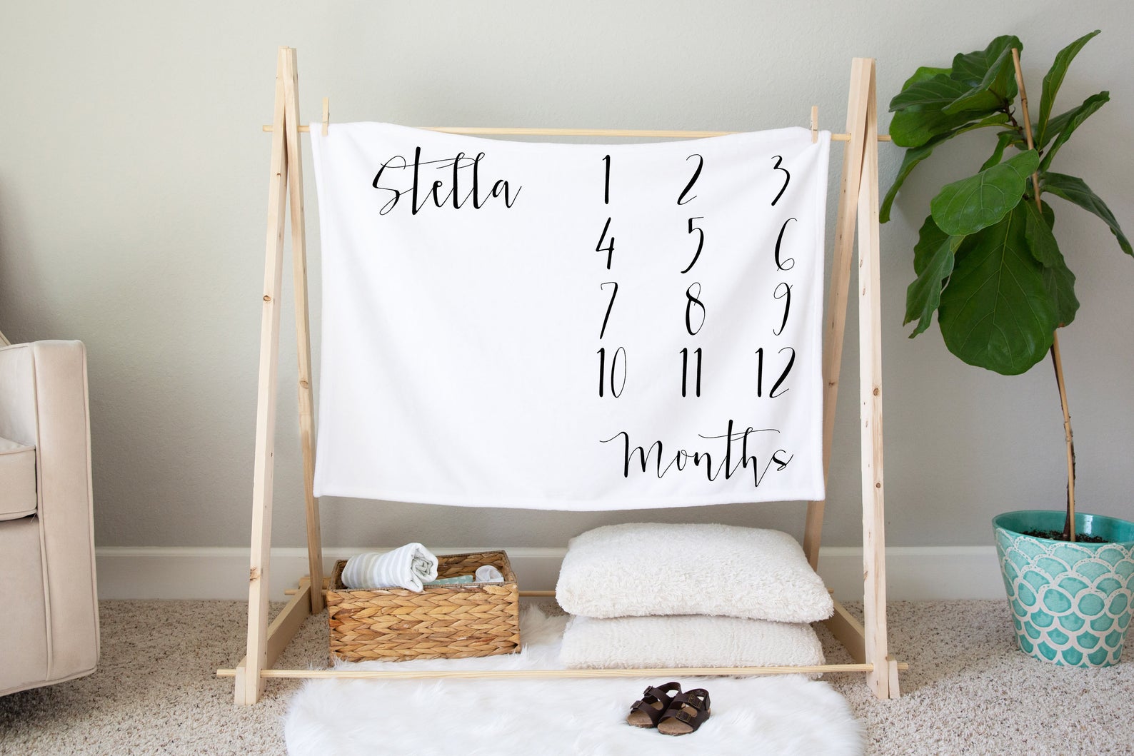 Instagram has given me a place to see all of the cute, new baby things and I wish I were having another baby all over again. (PS. Only in fleeting, dream-like thoughts, not in reality.) One trend I love is milestone blankets. Capturing this monthly photo takes very little effort to set up.